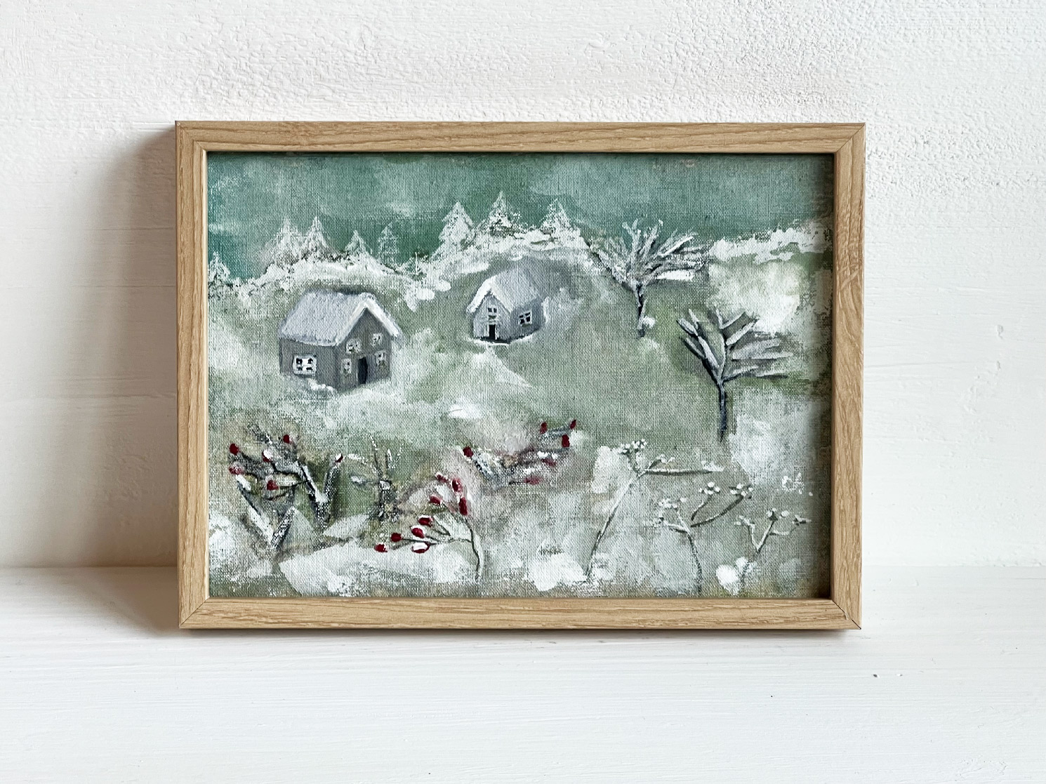(*) Peinture acrylique et pastels originale sur tissus ancien collée sur carton bois d’encadrement (sans acide).